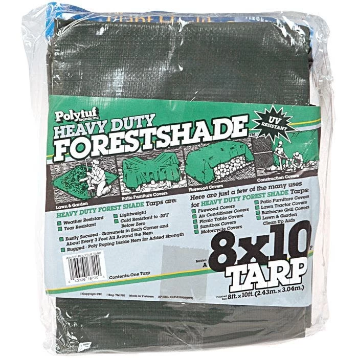 - Fabricated from a rugged 10 x 10 woven polyethylene fabric, laminated with polyethylene film, brass plated steel grommets every three feet, rope sewn into hem around entire perimeter, 4.5oz., 9-10 mil thickness, forest green, 8ft. x 10ft.