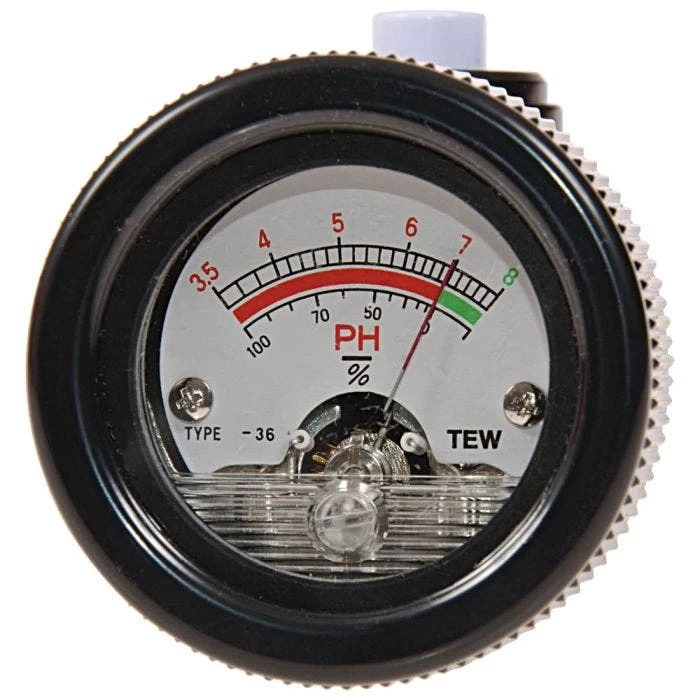Push button switch for measuring pH ranges from 3.5 to 8. Can be calibrated to maintain accuracy. Also measures soil moisture. Accuracy +/- .2 pH in acidic soils. Not designed for alkaline soils of 7.5+ pH or greater. Case included, 6 1/2in. long.