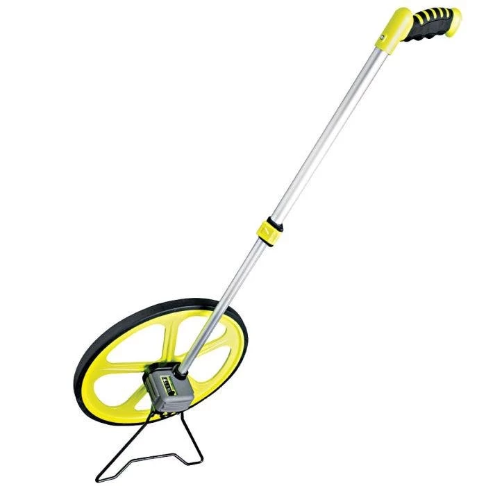 The entire unit folds for easy transport and storage. The gear-driven 5-digit counter allows for accurate readings up to 10,000 feet. Reset your measurement with a push of a button. Komelon equipped this measuring wheel with a spring-loaded kickstand.