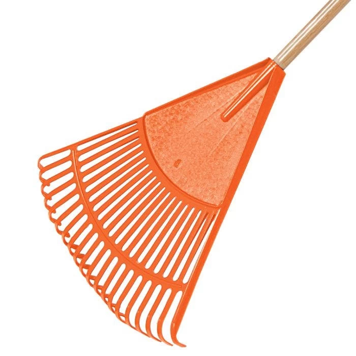 Moderate sized poly rake is suited for small yard spaces or targeted applications such as hedge or plant trimming cleanup and landscape bed clean out. High impact poly construction resists cracking, even in cold weather, and the partially ribbed tine construction maintains tine shape. 15/16in diameter coated hardwood handle. 54in handle length. Ship wt 1.5 lb.