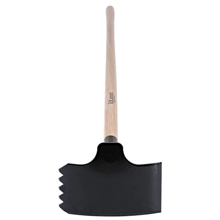 The Leonard Titan Hoe is a 3 sided tool that features a straight 4 1/2 inch side blade, a 9 inch wide bottom blade, and a 3 1/2 inch toothed blade. It also has a riveted 1 1/4 inch American Ash handle.