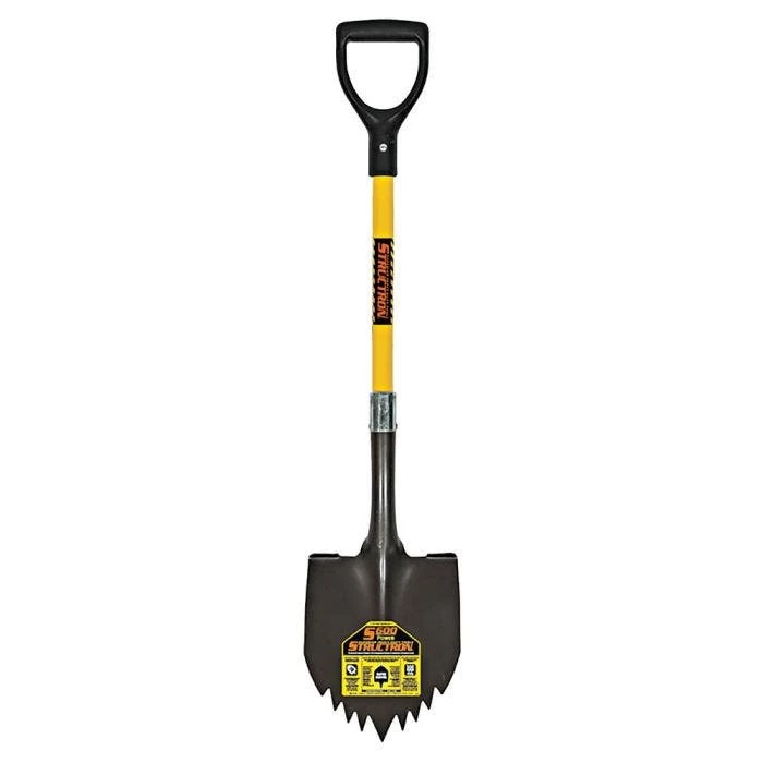 Seymour S600 Super Shovel is more robust than other shovels with a traditional 14ga blade. Its 9″ wide by 11″ shovel blade features forward turned steps and cutting teeth along the digging edge of the blade, making it ideal for extreme digging conditions such as rooted, rocky, compact soil and gravel. It is also great for digging in frost and icy conditions.