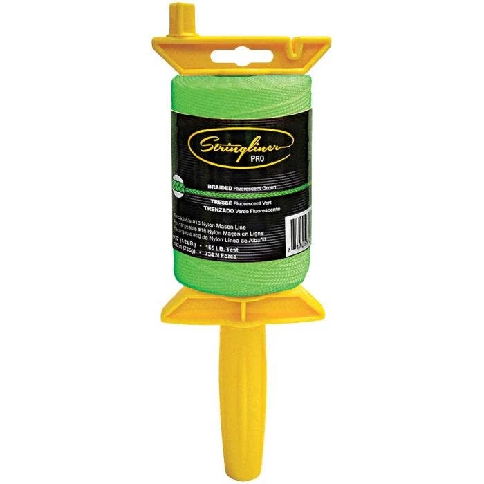 Stringliner Pro Line Reels include a reel of #18 braided nylon twine. This braided line resists abrasion and has a tensile strength of 165 pounds. This line will not unravel as easily when cut or reused. Find replacement line rolls HERE. You can use these reels with any line with a 1-inch core, from 4 to 6 inches long.