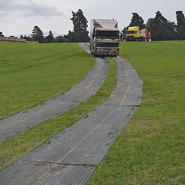 Commercial Grade ground protection mats, TrakMAT is ideal for the Green Industry. Designed to move large vehicles and heavy equipment over lawns, sidewalks, driveways, and more without causing damage. Supports loads up to 180,000lb or 90 tons. Great for general landscaping and construction equipment of any size. Featuring a Power Cylinder tread surface on both sides. This popular tread pattern provides maximum contact tire (track) to mat, and mat to ground contact.