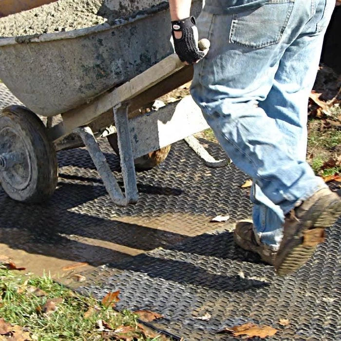 The most versatile ground protection mats in the industry! The Double-Sided Tread VersaMats feature a Slip-Resistant flat tread on one side and the diamond plate tread on the other. Ideal for use on and off-road, from industrial equipment to pedestrian foot traffic. The flat and low profile Slip-Resistant tread reduces trip hazard and provides excellent grip for foot traffic and heavy equipment. The Slip-Resistant Flat tread is safe for use face down on paved surfaces. For events, to protect turf areas from excessive foot traffic, use the Slip-Resistant flat tread up to create a safe walkway or common area. And the other side in the same Diamond Plate tread design as AlturnaMats offers the same list of off-road applications.