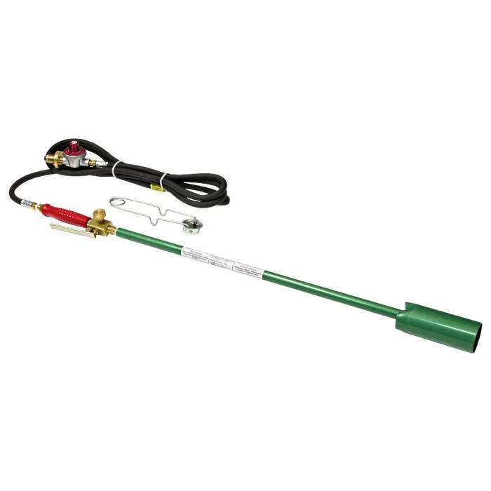 From weeds in the lawn, garden and driveway to weeds and brush in the fields, fence lines and irrigation ditches. Uses a gas grill type propane cylinder, not included. This model’s 2″bell, 100,000 BTU torch produces a roughly 12″long flame with hottest temperature around 6″from nozzle. This size provides a more narrow, targeted flame than larger model. Beneficial for certain applications around tighter areas where a more targeted flame is best.