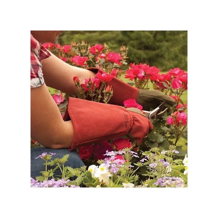 100% synthetic suede is tough enough to keep thorns out, but supple enough for delicate tasks. Padded palms and reinforced finger pads protect against thorns, prickly stems, or abrasive logs. Extended elbow-length gauntlet cuffs shield your forearms and prevent snagged shirts. Designed for breathability and a comfortable fit. Machine washable. Ruby with olive palms, in unisex sizes.
